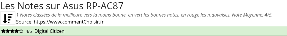 Les notes des sites et magazines internet peuvent etre peut-etre biaisés, au moins avec les avis client et des utilisateurs qui ont acheté Asus RP-AC87 sur amazon ou la fnac, on est sur d'avoir de vrais critiques sur ce produit. (les liens vers les magasins sont sponsorisés). Pour les jeux et quand cela est est possible nous listons aussi les notes moyennes sur les plateformes de consommateurs (comme IGDB)