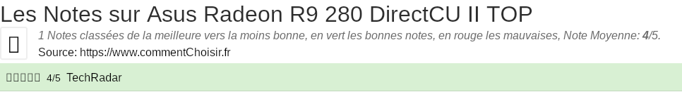 Les avis sur Asus Radeon R9 280 DirectCU II TOP en résumé gràce à ces review: Nous n'avons trouvé qu'un seul test sur ce produit, il est donc difficile de donner un avis global et cette note de 4/5 ne peut pas etre vraiment représentative.