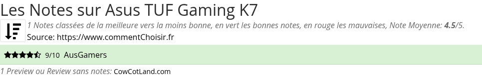 Les notes des sites et magazines internet peuvent etre peut-etre biaisés, au moins avec les avis client et des utilisateurs qui ont acheté Asus TUF Gaming K7 sur amazon ou la fnac, on est sur d'avoir de vrais critiques sur ce produit. (les liens vers les magasins sont sponsorisés). Pour les jeux et quand cela est est possible nous listons aussi les notes moyennes sur les plateformes de consommateurs (comme IGDB)