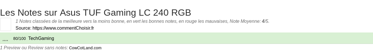 Les notes des sites et magazines internet peuvent etre peut-etre biaisés, au moins avec les avis client et des utilisateurs qui ont acheté Asus TUF Gaming LC 240 RGB sur amazon ou la fnac, on est sur d'avoir de vrais critiques sur ce produit. (les liens vers les magasins sont sponsorisés).