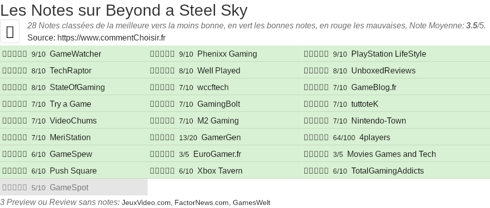 Parmis ces tests des sites & magazines internet spécialisés dans les Jeux, 28 ont donné une note et on obtient une note moyenne de 3.5/5 pour ce produit de Beyond a Steel Sky.