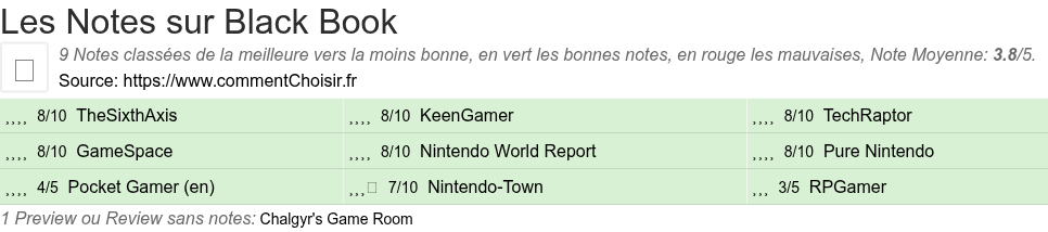 Parmis ces tests des sites & magazines internet spécialisés dans les Jeux, 9 ont donné une note et on obtient une note moyenne de 3.8/5 pour ce produit de Black Book.
