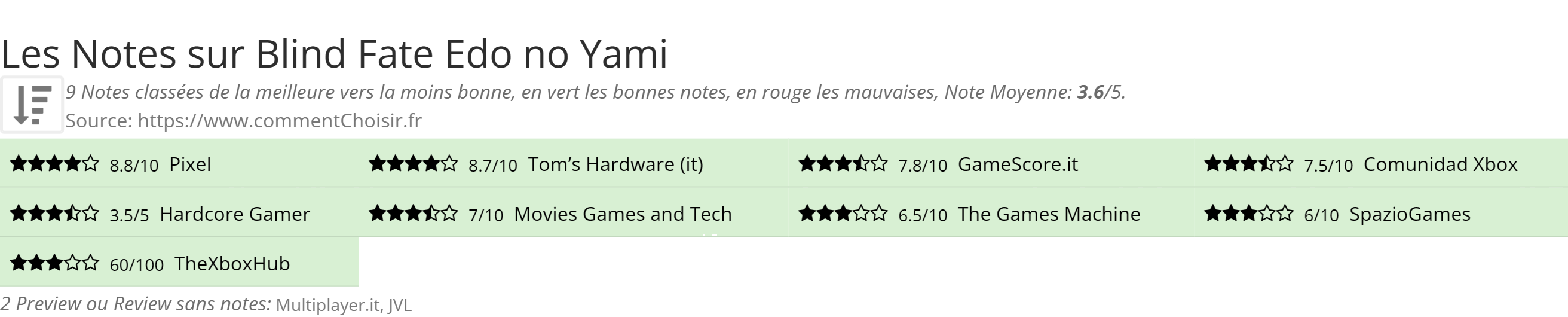 Les notes des sites et magazines internet peuvent etre peut-etre biaisés, au moins avec les avis client et des utilisateurs qui ont acheté Blind Fate Edo no Yami sur amazon ou la fnac, on est sur d'avoir de vrais critiques sur ce produit. (les liens vers les magasins sont sponsorisés). Pour les jeux et quand cela est est possible nous listons aussi les notes moyennes sur les plateformes de consommateurs (comme IGDB)
