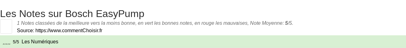 Les notes des sites et magazines internet peuvent etre peut-etre biaisés, au moins avec les avis client et des utilisateurs qui ont acheté Bosch EasyPump sur amazon ou la fnac, on est sur d'avoir de vrais critiques sur ce produit. (les liens vers les magasins sont sponsorisés). Pour les jeux et quand cela est est possible nous listons aussi les notes moyennes sur les plateformes de consommateurs (comme IGDB)