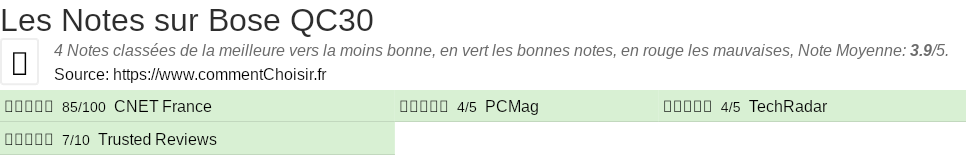 Parmis ces tests des sites & magazines internet spécialisés dans les Casque, 4 ont donné une note et on obtient une note moyenne de 3.9/5 pour ce produit de Bose.