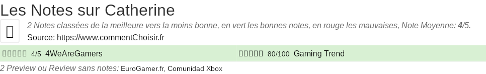 Parmis ces tests des sites & magazines internet spécialisés dans les Jeux, 2 ont donné une note et on obtient une note moyenne de 4/5 pour ce produit de Catherine.