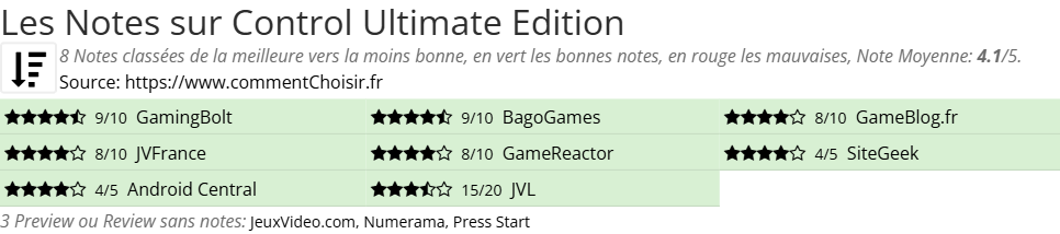 Parmis ces tests des sites & magazines internet spécialisés dans les Jeux, 8 ont donné une note et on obtient une note moyenne de 4.1/5 pour ce produit de Control.