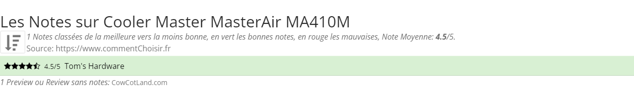 Les notes des sites et magazines internet peuvent etre peut-etre biaisés, au moins avec les avis client et des utilisateurs qui ont acheté Cooler Master MasterAir MA410M sur amazon ou la fnac, on est sur d'avoir de vrais critiques sur ce produit. (les liens vers les magasins sont sponsorisés).