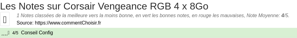Parmis ces tests des sites & magazines internet spécialisés dans les Composants, 1 ont donné une note et on obtient une note moyenne de 4/5 pour ce produit de Corsair.