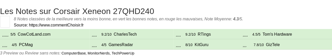 Les notes des sites et magazines internet peuvent etre peut-etre biaisés, au moins avec les avis client et des utilisateurs qui ont acheté Corsair Xeneon 27QHD240 sur amazon ou la fnac, on est sur d'avoir de vrais critiques sur ce produit. (les liens vers les magasins sont sponsorisés). Pour les jeux et quand cela est est possible nous listons aussi les notes moyennes sur les plateformes de consommateurs (comme IGDB)