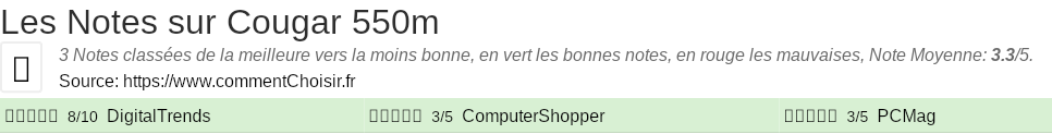 Les notes des sites et magazines internet peuvent etre peut-etre biaisés, au moins avec les avis client et des utilisateurs qui ont acheté Cougar 550m sur amazon ou la fnac, on est sur d'avoir de vrais critiques sur ce produit. (les liens vers les magasins sont sponsorisés).
