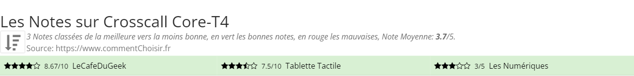 Parmis ces tests des sites & magazines internet spécialisés dans les Tablette, 3 ont donné une note et on obtient une note moyenne de 3.5/5 pour ce produit de Crosscall.