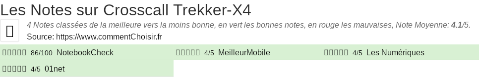 Parmis ces tests des sites & magazines internet spécialisés dans les Téléphone portable, 4 ont donné une note et on obtient une note moyenne de 4.1/5 pour ce produit de Crosscall.