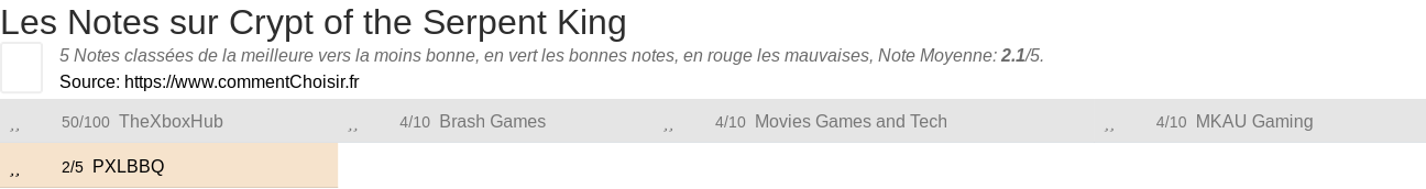 Pour mieux comparer, nous avons cherché pour vous les avantages et inconvénients de Crypt of the Serpent King et les notes données par les sites spécialisés.