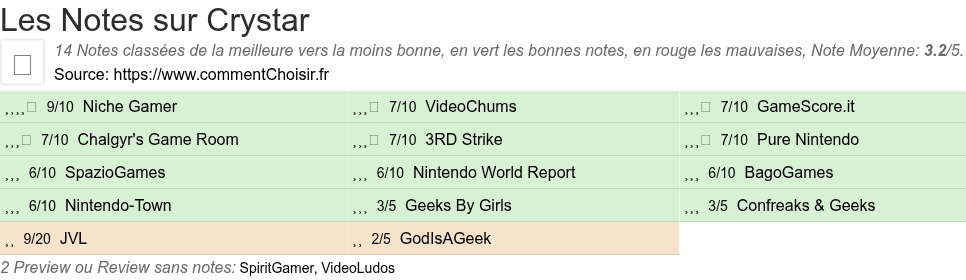 Voici tous les 16 avis et les tests que nous avons trouvé sur le Jeux Crystar avec les 14 notes et les commentaires des testeurs dans leur review.