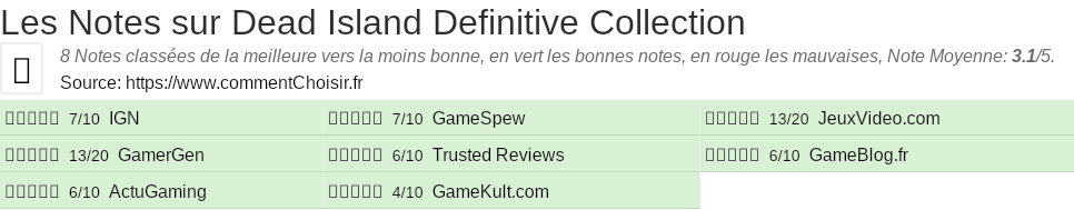 Parmis ces tests des sites & magazines internet spécialisés dans les Jeux, 8 ont donné une note et on obtient une note moyenne de 3.1/5 pour ce produit de Dead Island.