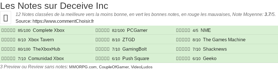 Les notes des sites et magazines internet peuvent etre peut-etre biaisés, au moins avec les avis client et des utilisateurs qui ont acheté Deceive Inc sur amazon ou la fnac, on est sur d'avoir de vrais critiques sur ce produit. (les liens vers les magasins sont sponsorisés). Pour les jeux et quand cela est est possible nous listons aussi les notes moyennes sur les plateformes de consommateurs (comme IGDB)