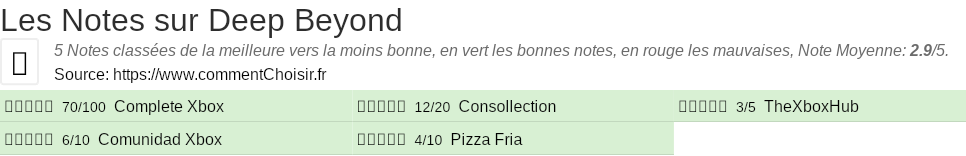 Les notes des sites et magazines internet peuvent etre peut-etre biaisés, au moins avec les avis client et des utilisateurs qui ont acheté Deep Beyond sur amazon ou la fnac, on est sur d'avoir de vrais critiques sur ce produit. (les liens vers les magasins sont sponsorisés). Pour les jeux et quand cela est est possible nous listons aussi les notes moyennes sur les plateformes de consommateurs (comme IGDB)