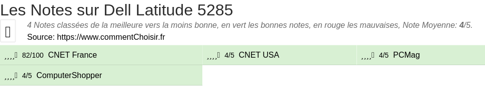 Les notes des sites et magazines internet peuvent etre peut-etre biaisés, au moins avec les avis client et des utilisateurs qui ont acheté Dell Latitude 5285 sur amazon ou la fnac, on est sur d'avoir de vrais critiques sur ce produit. (les liens vers les magasins sont sponsorisés). Pour les jeux et quand cela est est possible nous listons aussi les notes moyennes sur les plateformes de consommateurs (comme IGDB)
