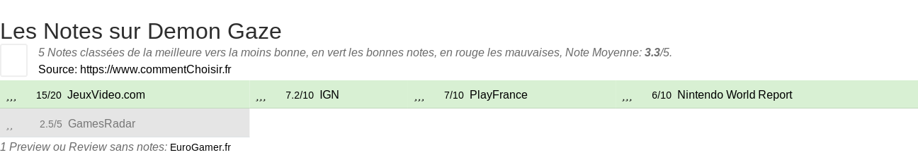 Les notes des sites et magazines internet peuvent etre peut-etre biaisés, au moins avec les avis client et des utilisateurs qui ont acheté Demon Gaze sur amazon ou la fnac, on est sur d'avoir de vrais critiques sur ce produit. (les liens vers les magasins sont sponsorisés). Pour les jeux et quand cela est est possible nous listons aussi les notes moyennes sur les plateformes de consommateurs (comme IGDB) L'EAN du produit testé, son code barre, est le 0813633019789.