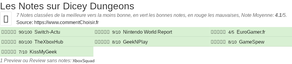 Les notes des sites et magazines internet peuvent etre peut-etre biaisés, au moins avec les avis client et des utilisateurs qui ont acheté Dicey Dungeons sur amazon ou la fnac, on est sur d'avoir de vrais critiques sur ce produit. (les liens vers les magasins sont sponsorisés). Pour les jeux et quand cela est est possible nous listons aussi les notes moyennes sur les plateformes de consommateurs (comme IGDB)