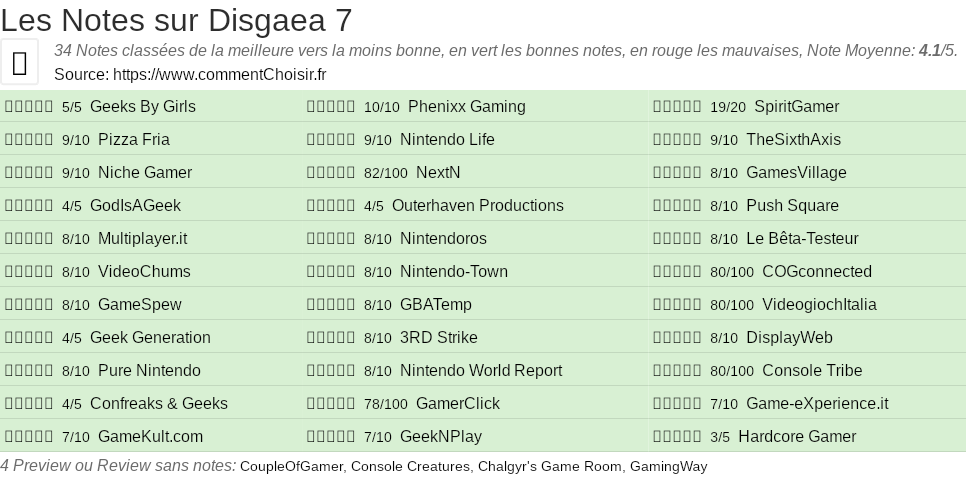 Les notes des sites et magazines internet peuvent etre peut-etre biaisés, au moins avec les avis client et des utilisateurs qui ont acheté Disgaea 7 sur amazon ou la fnac, on est sur d'avoir de vrais critiques sur ce produit. (les liens vers les magasins sont sponsorisés). Pour les jeux et quand cela est est possible nous listons aussi les notes moyennes sur les plateformes de consommateurs (comme IGDB)