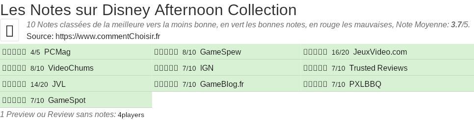Parmis ces tests des sites & magazines internet spécialisés dans les Jeux, 10 ont donné une note et on obtient une note moyenne de 3.7/5 pour ce produit de Disney.