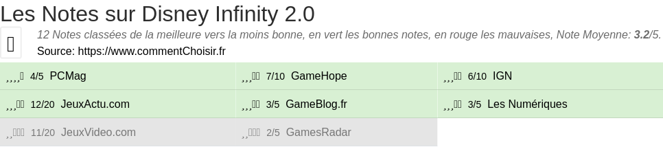 Parmis ces tests des sites & magazines internet spécialisés dans les Jeux, 12 ont donné une note et on obtient une note moyenne de 3.2/5 pour ce produit de Disney.