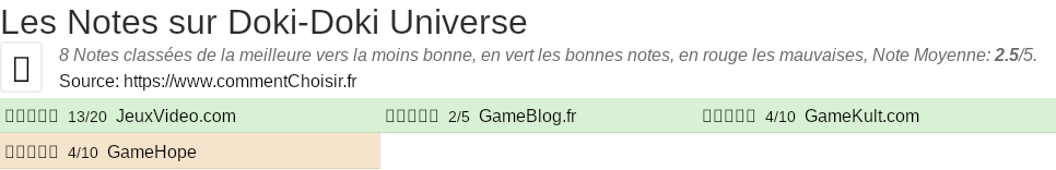 Les notes des sites et magazines internet peuvent etre peut-etre biaisés, au moins avec les avis client et des utilisateurs qui ont acheté Doki-Doki Universe sur amazon ou la fnac, on est sur d'avoir de vrais critiques sur ce produit. (les liens vers les magasins sont sponsorisés). Pour les jeux et quand cela est est possible nous listons aussi les notes moyennes sur les plateformes de consommateurs (comme IGDB)