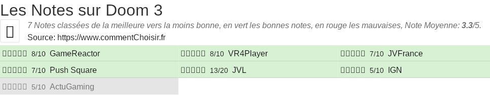Parmis ces tests des sites & magazines internet spécialisés dans les Jeux, 7 ont donné une note et on obtient une note moyenne de 3.3/5 pour ce produit de Doom.