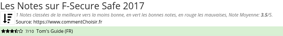 Parmis ces tests des sites & magazines internet spécialisés dans les Logiciels, 1 ont donné une note et on obtient une note moyenne de 3.5/5 pour ce produit de F-Secure.