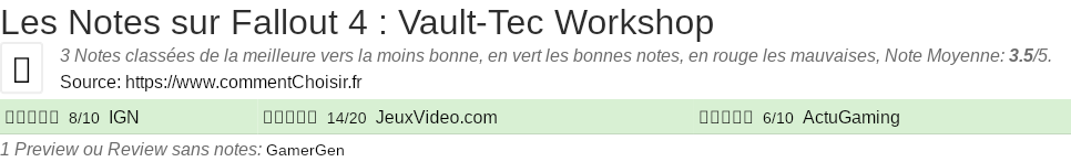 Les notes des sites et magazines internet peuvent etre peut-etre biaisés, au moins avec les avis client et des utilisateurs qui ont acheté Fallout 4 : Vault-Tec Workshop sur amazon ou la fnac, on est sur d'avoir de vrais critiques sur ce produit. (les liens vers les magasins sont sponsorisés). Pour les jeux et quand cela est est possible nous listons aussi les notes moyennes sur les plateformes de consommateurs (comme IGDB)