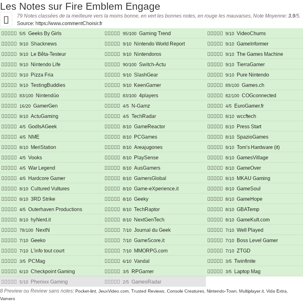 Les notes des sites et magazines internet peuvent etre peut-etre biaisés, au moins avec les avis client et des utilisateurs qui ont acheté Fire Emblem Engage sur amazon ou la fnac, on est sur d'avoir de vrais critiques sur ce produit. (les liens vers les magasins sont sponsorisés). Pour les jeux et quand cela est est possible nous listons aussi les notes moyennes sur les plateformes de consommateurs (comme IGDB) L'EAN du produit testé, son code barre, est le 0045496478605.