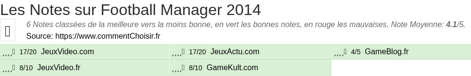 Les notes des sites et magazines internet peuvent etre peut-etre biaisés, au moins avec les avis client et des utilisateurs qui ont acheté Football Manager 2014 sur amazon ou la fnac, on est sur d'avoir de vrais critiques sur ce produit. (les liens vers les magasins sont sponsorisés). Pour les jeux et quand cela est est possible nous listons aussi les notes moyennes sur les plateformes de consommateurs (comme IGDB) L'EAN du produit testé, son code barre, est le 5055277021833.