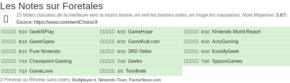 Voici tous les 18 avis et les tests que nous avons trouvé sur le Jeux Foretales avec les 15 notes et les commentaires des testeurs dans leur review.