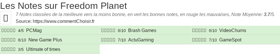 Les notes des sites et magazines internet peuvent etre peut-etre biaisés, au moins avec les avis client et des utilisateurs qui ont acheté Freedom Planet sur amazon ou la fnac, on est sur d'avoir de vrais critiques sur ce produit. (les liens vers les magasins sont sponsorisés). Pour les jeux et quand cela est est possible nous listons aussi les notes moyennes sur les plateformes de consommateurs (comme IGDB)