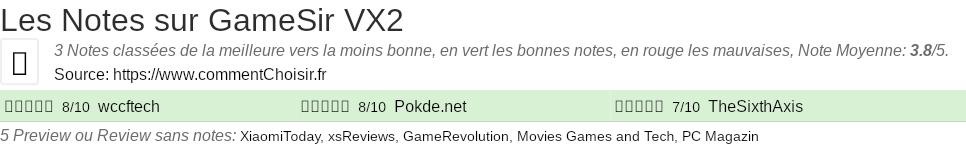 Parmis ces tests des sites & magazines internet spécialisés dans les Accessoires Consoles de jeux, 3 ont donné une note et on obtient une note moyenne de 3.8/5 pour ce produit de GameSir.