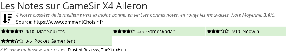 Les notes des sites et magazines internet peuvent etre peut-etre biaisés, au moins avec les avis client et des utilisateurs qui ont acheté GameSir X4 Aileron sur amazon ou la fnac, on est sur d'avoir de vrais critiques sur ce produit. (les liens vers les magasins sont sponsorisés).