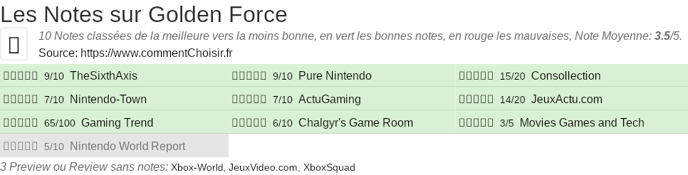 Parmis ces tests des sites & magazines internet spécialisés dans les Jeux, 10 ont donné une note et on obtient une note moyenne de 3.5/5 pour ce produit de Golden Force.