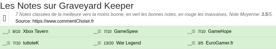 Parmis ces tests des sites & magazines internet spécialisés dans les Jeux, 7 ont donné une note et on obtient une note moyenne de 3.5/5 pour ce produit de Graveyard Keeper.