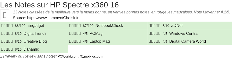 Parmis ces tests des sites & magazines internet spécialisés dans les Ordinateurs Portables, 13 ont donné une note et on obtient une note moyenne de 4.1/5 pour ce produit de HP.