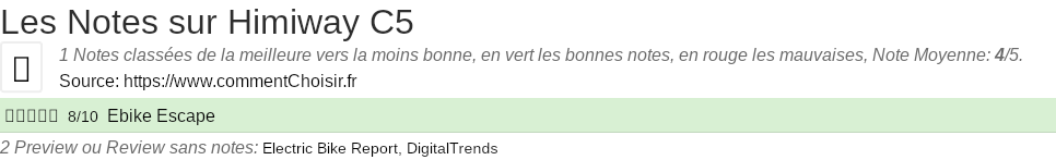 Parmis ces tests des sites & magazines internet spécialisés dans les Vélos et trotinettes, 1 ont donné une note et on obtient une note moyenne de 4/5 pour ce produit de Himiway.