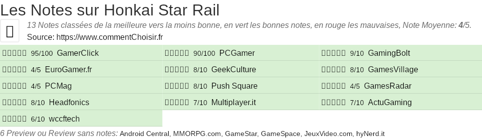 Voici tous les 19 avis et les tests que nous avons trouvé sur le Jeux Honkai Star Rail avec les 13 notes et les commentaires des testeurs dans leur review.