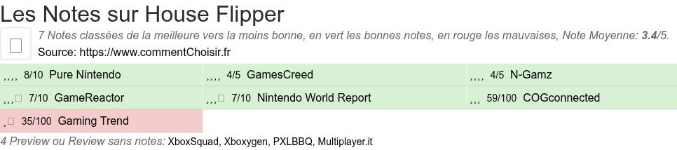 Parmis ces tests des sites & magazines internet spécialisés dans les Jeux, 7 ont donné une note et on obtient une note moyenne de 3.4/5 pour ce produit de House Flipper.
