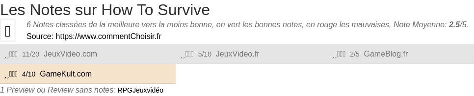 Les notes des sites et magazines internet peuvent etre peut-etre biaisés, au moins avec les avis client et des utilisateurs qui ont acheté How To Survive sur amazon ou la fnac, on est sur d'avoir de vrais critiques sur ce produit. (les liens vers les magasins sont sponsorisés). Pour les jeux et quand cela est est possible nous listons aussi les notes moyennes sur les plateformes de consommateurs (comme IGDB)