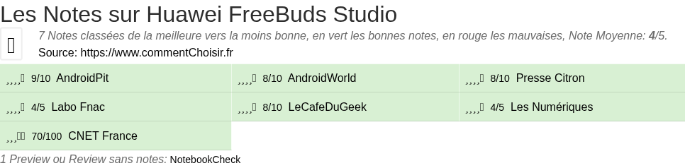 Voici tous les 8 avis et les tests que nous avons trouvé sur le Casque Huawei FreeBuds Studio avec les 7 notes et les commentaires des testeurs dans leur review.
