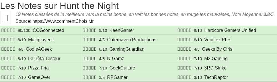 Parmis ces tests des sites & magazines internet spécialisés dans les Jeux, 19 ont donné une note et on obtient une note moyenne de 3.8/5 pour ce produit de Hunt the Night.