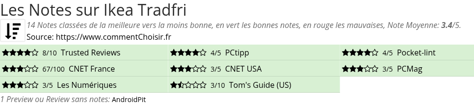 Parmis ces tests des sites & magazines internet spécialisés dans les Domotique, 14 ont donné une note et on obtient une note moyenne de 3.4/5 pour ce produit de Ikea.