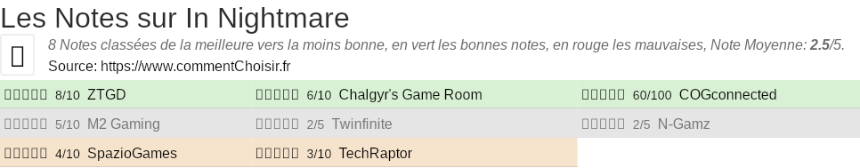 Voici tous les 8 avis et les tests que nous avons trouvé sur le Jeux In Nightmare avec les 8 notes et les commentaires des testeurs dans leur review.