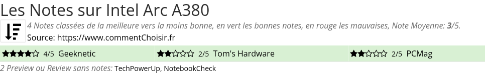 Les notes des sites et magazines internet peuvent etre peut-etre biaisés, au moins avec les avis client et des utilisateurs qui ont acheté Intel Arc A380 sur amazon ou la fnac, on est sur d'avoir de vrais critiques sur ce produit. (les liens vers les magasins sont sponsorisés).